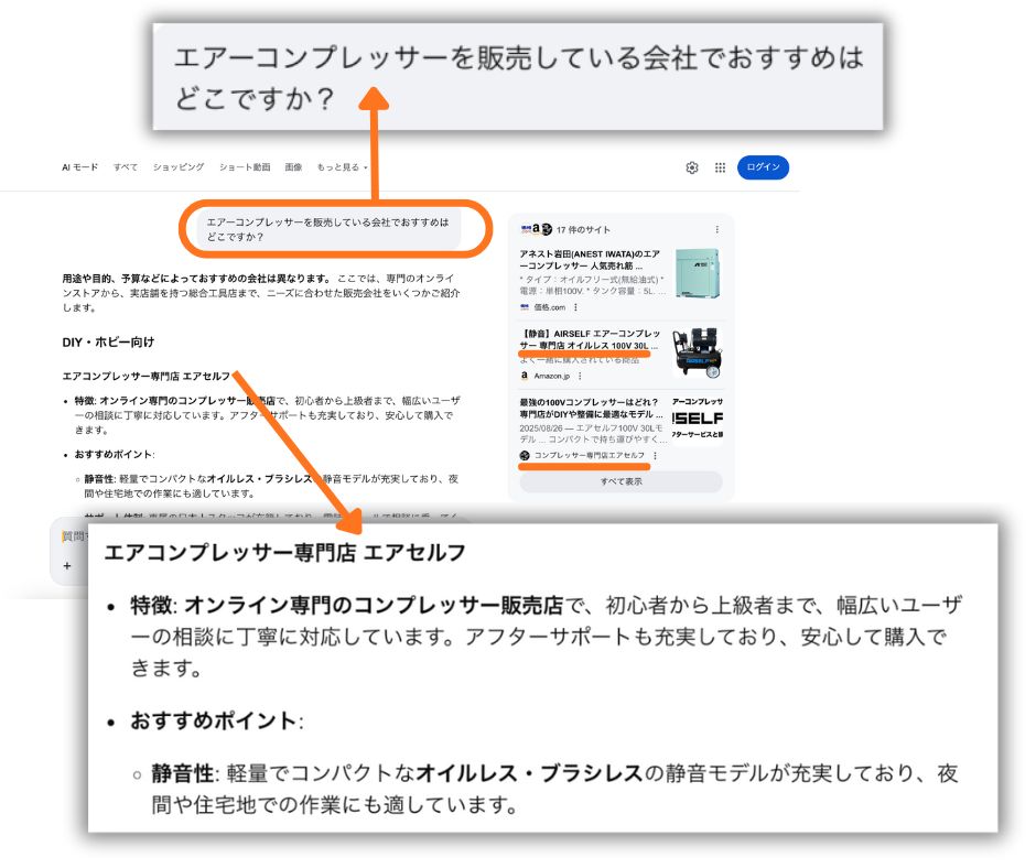 このAIO対策は、机上の理論ではありません。実際に、エアーコンプレッサー専門通販サイト「エアセルフ」が自社ブランドで導入し、Google AI OverviewやPerplexityで会社名・商品名が“推薦表示”される状態を実現しました。